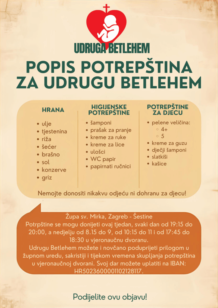 Župljani Župe sv. Mirka za Udrugu Betlehem 24. studenoga 2025.26. studenoga 2025. IBAN: HR5023600001102128117