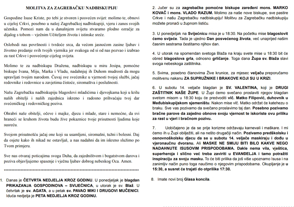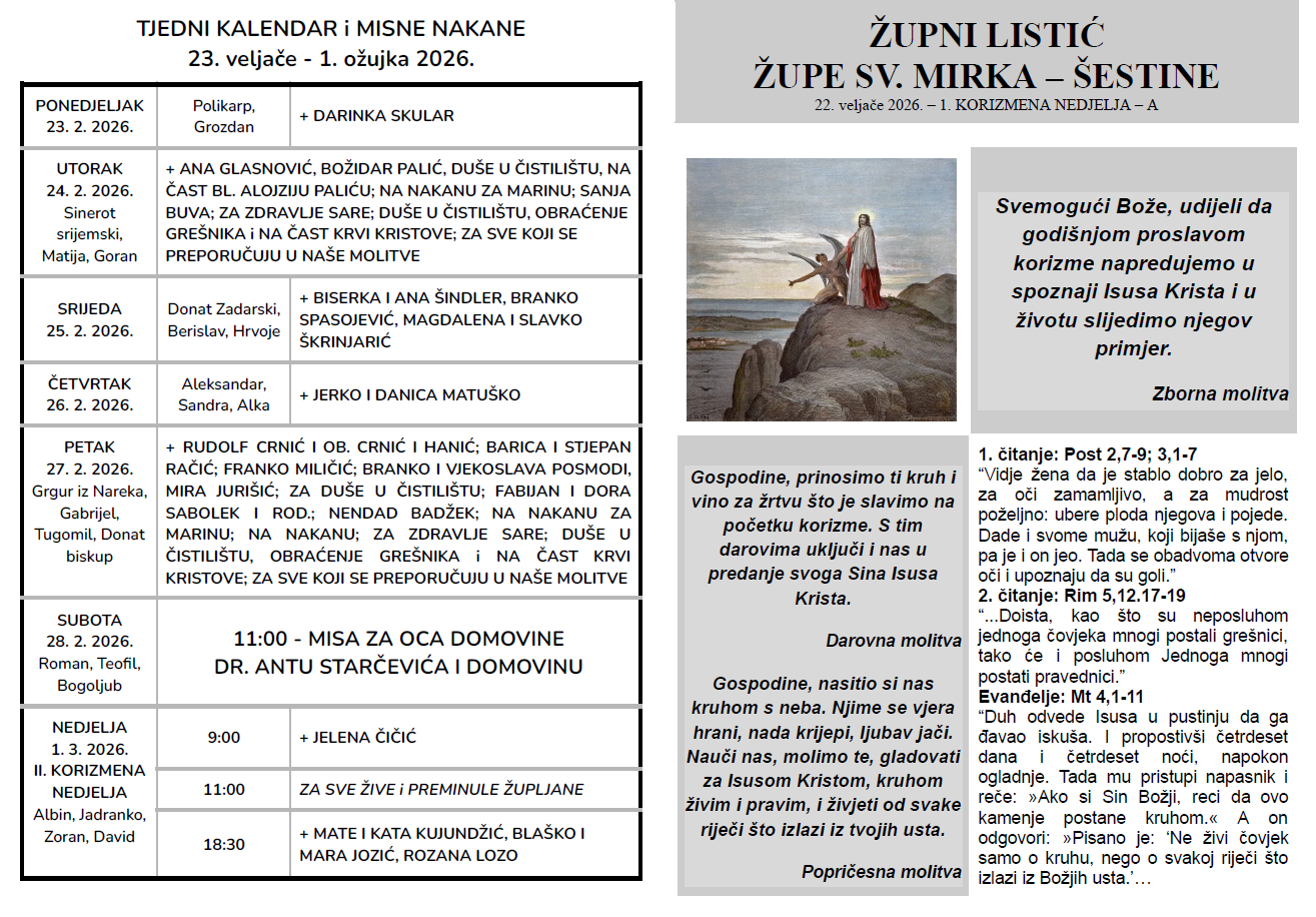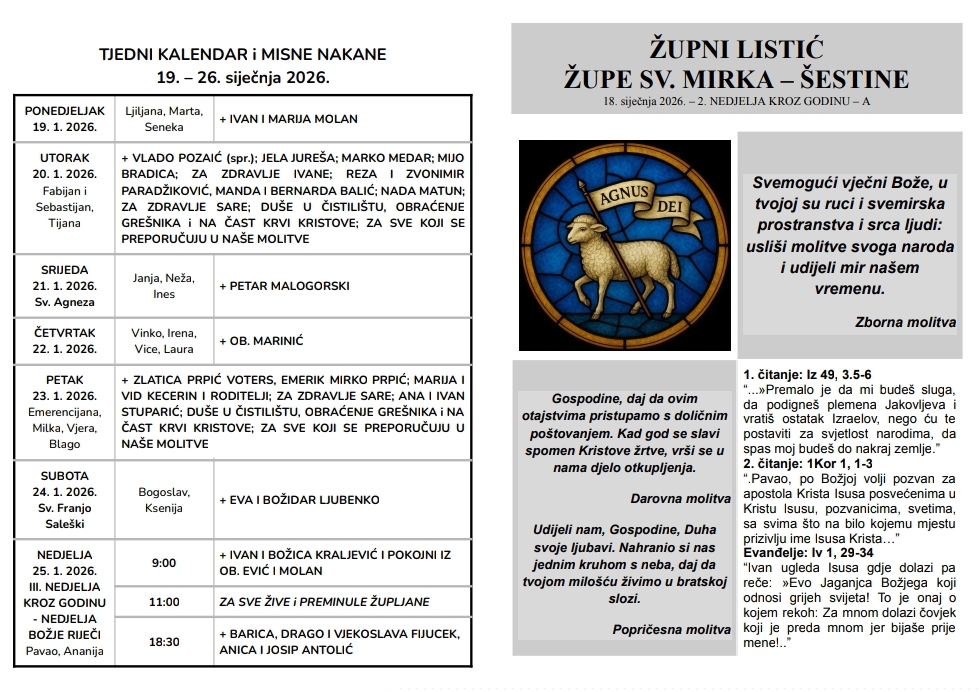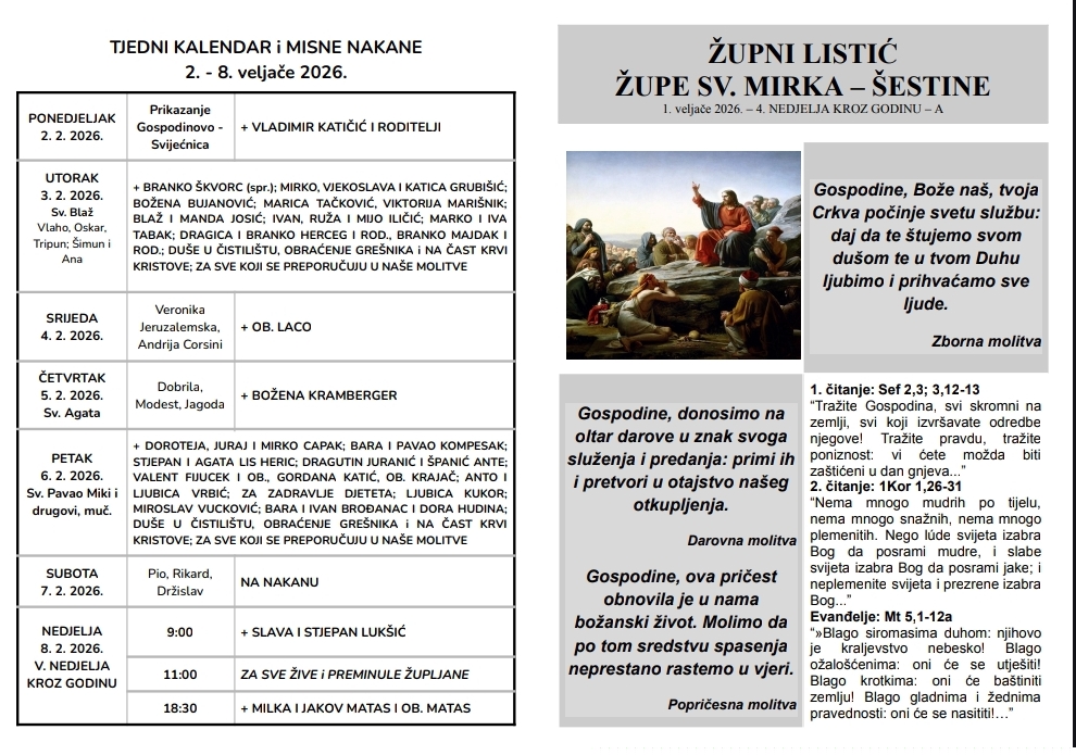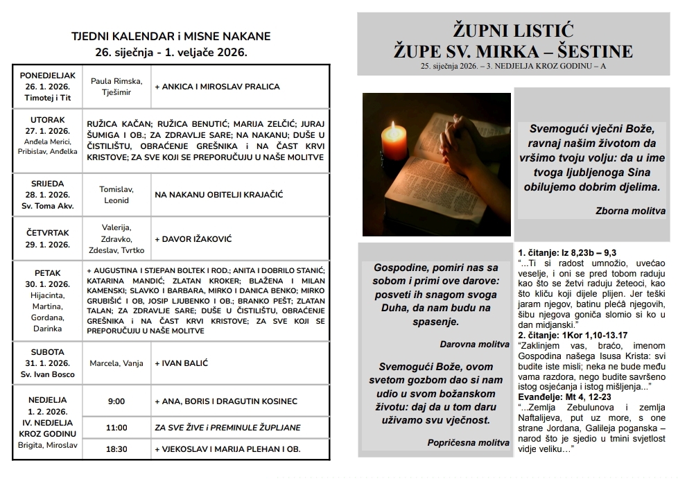 Ovdje možete pronaći župni listić s najvažnijim obavijestima vezanim za našu župu i tjednim kalendarom misnih nakana.